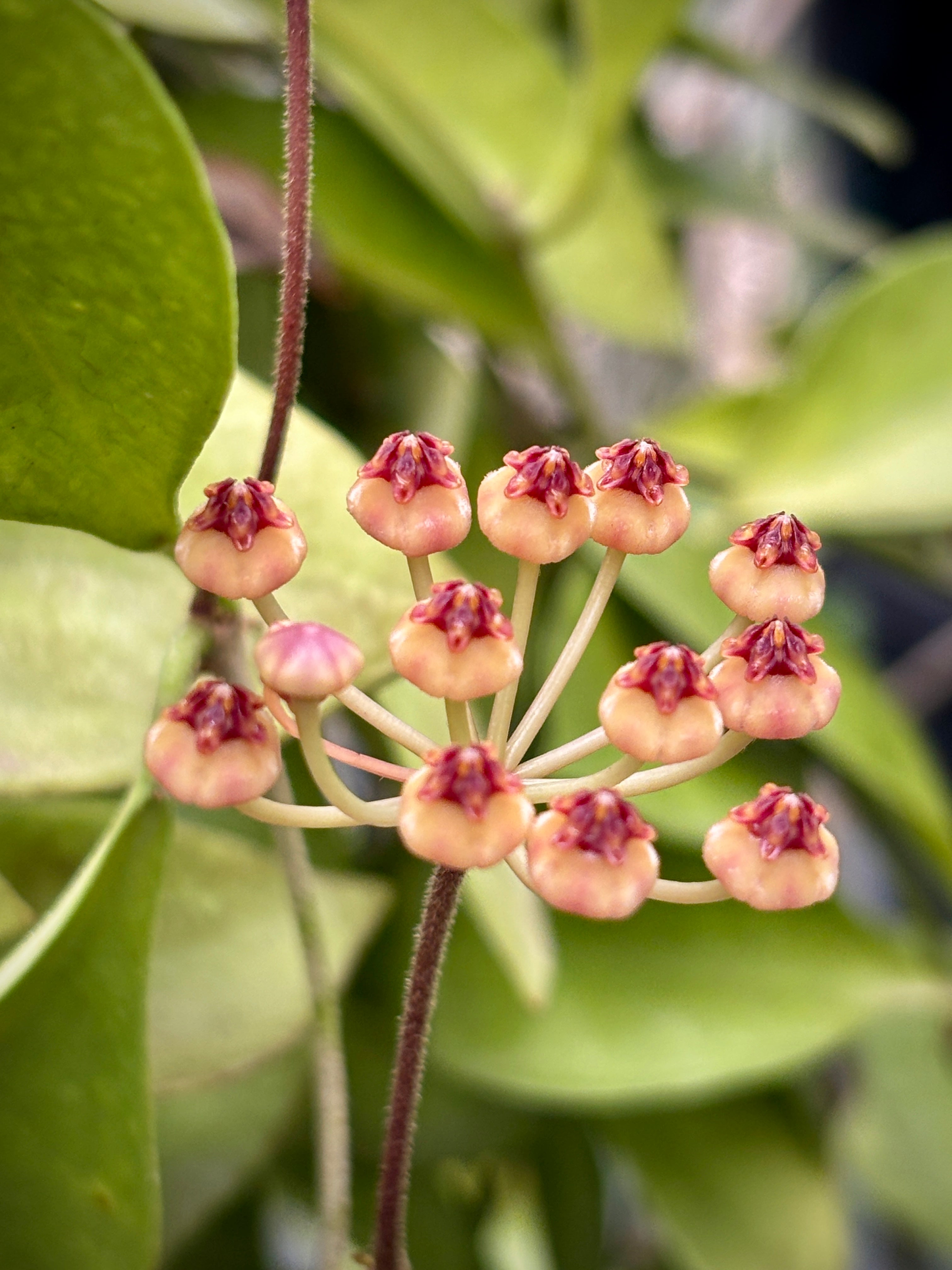 Blooms: Delightful, revolute reddish-maroon flowers, measuring 5mm, with darker maroon corona. Up to 20 flowers per umbel. Nectar producing. Delicious, sweet butterscotch-like fragrance!