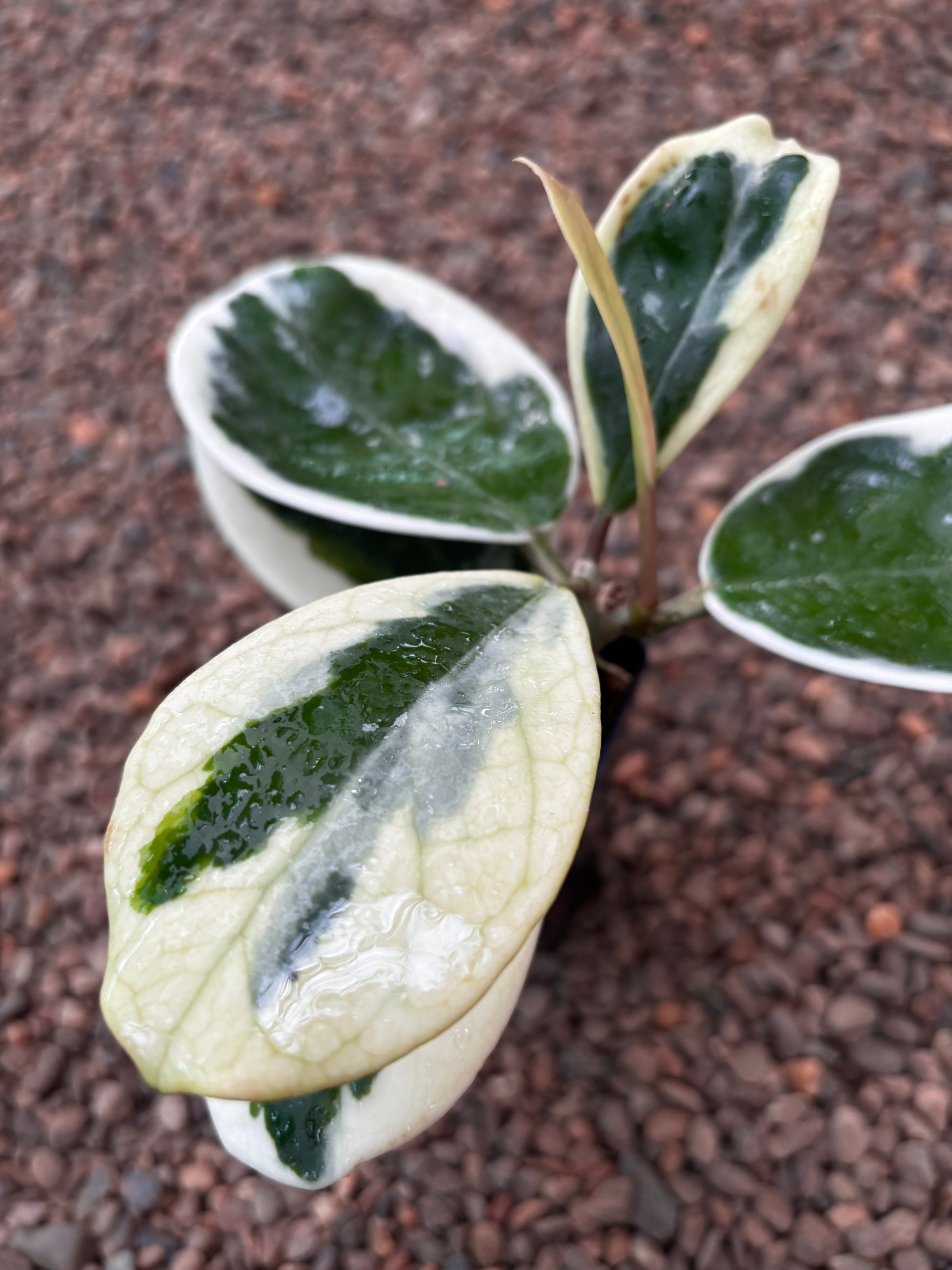 A real stunner! Thick, round leaves with dark-green centres and yellow-lime margins, measuring up to 10cm in diameter.
