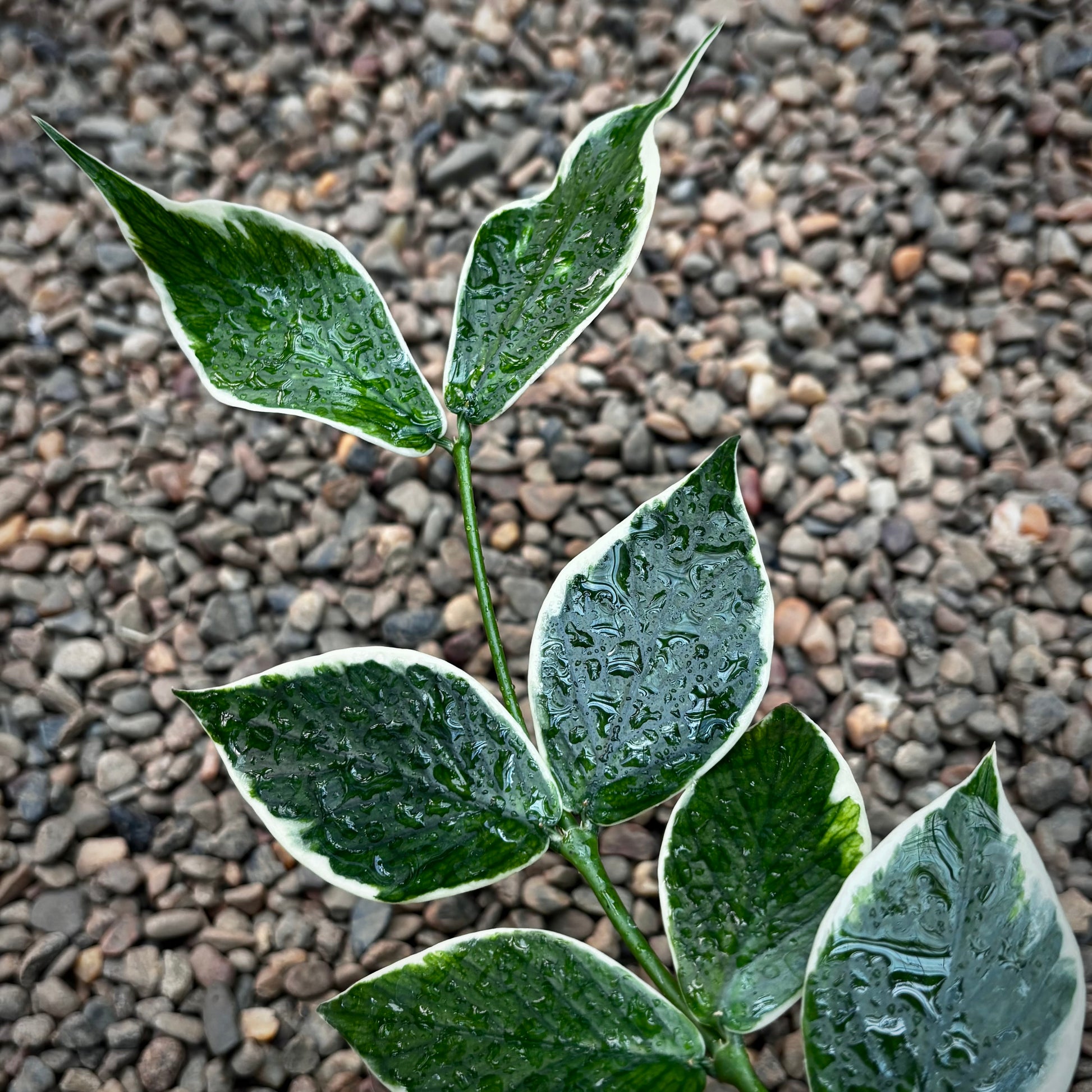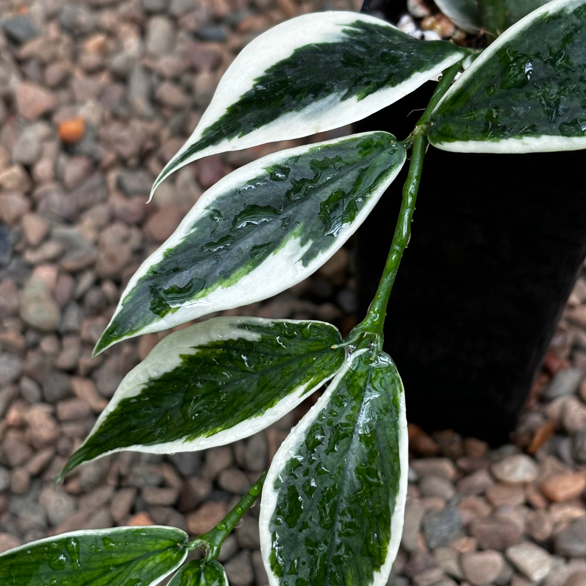 Stunning dark green leaves with prominent white margins, up to 8cm x 4cm. Commonly referred to as the ‘Fishtail Hoya’ on account of its particular leaf growth pattern.