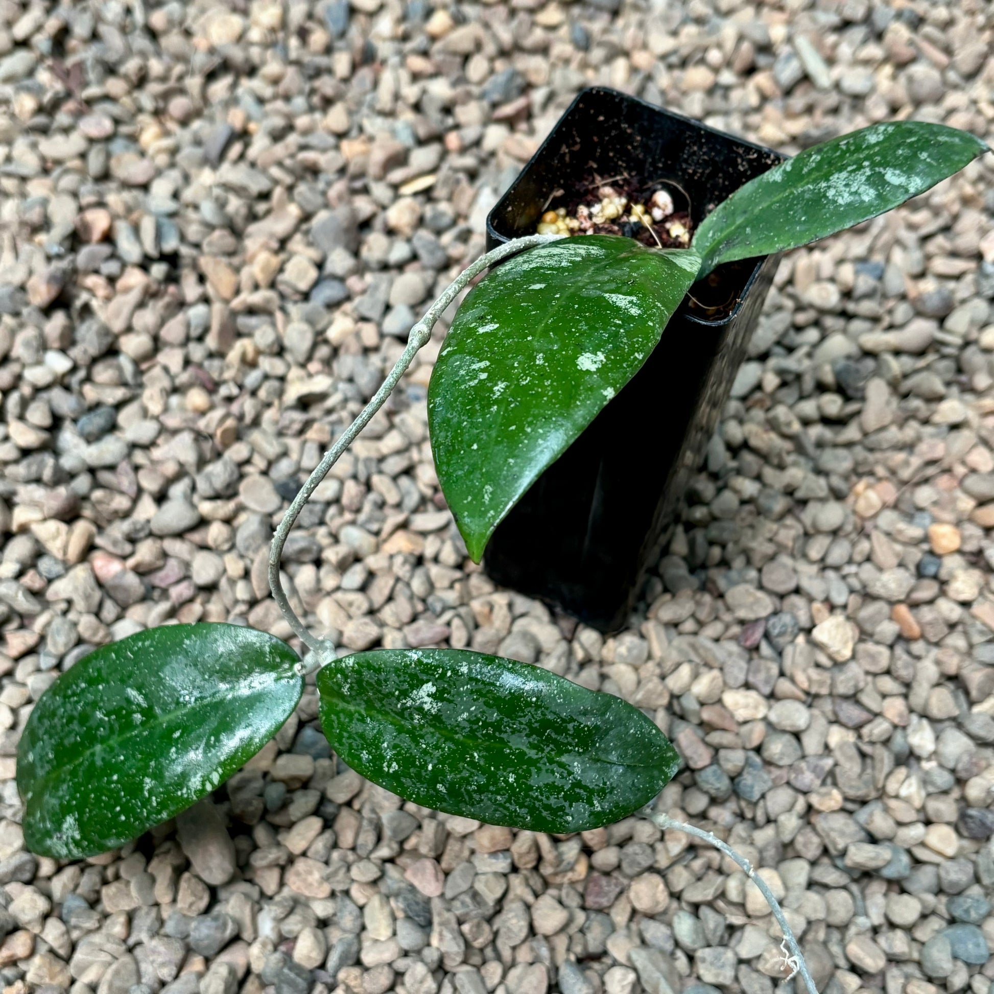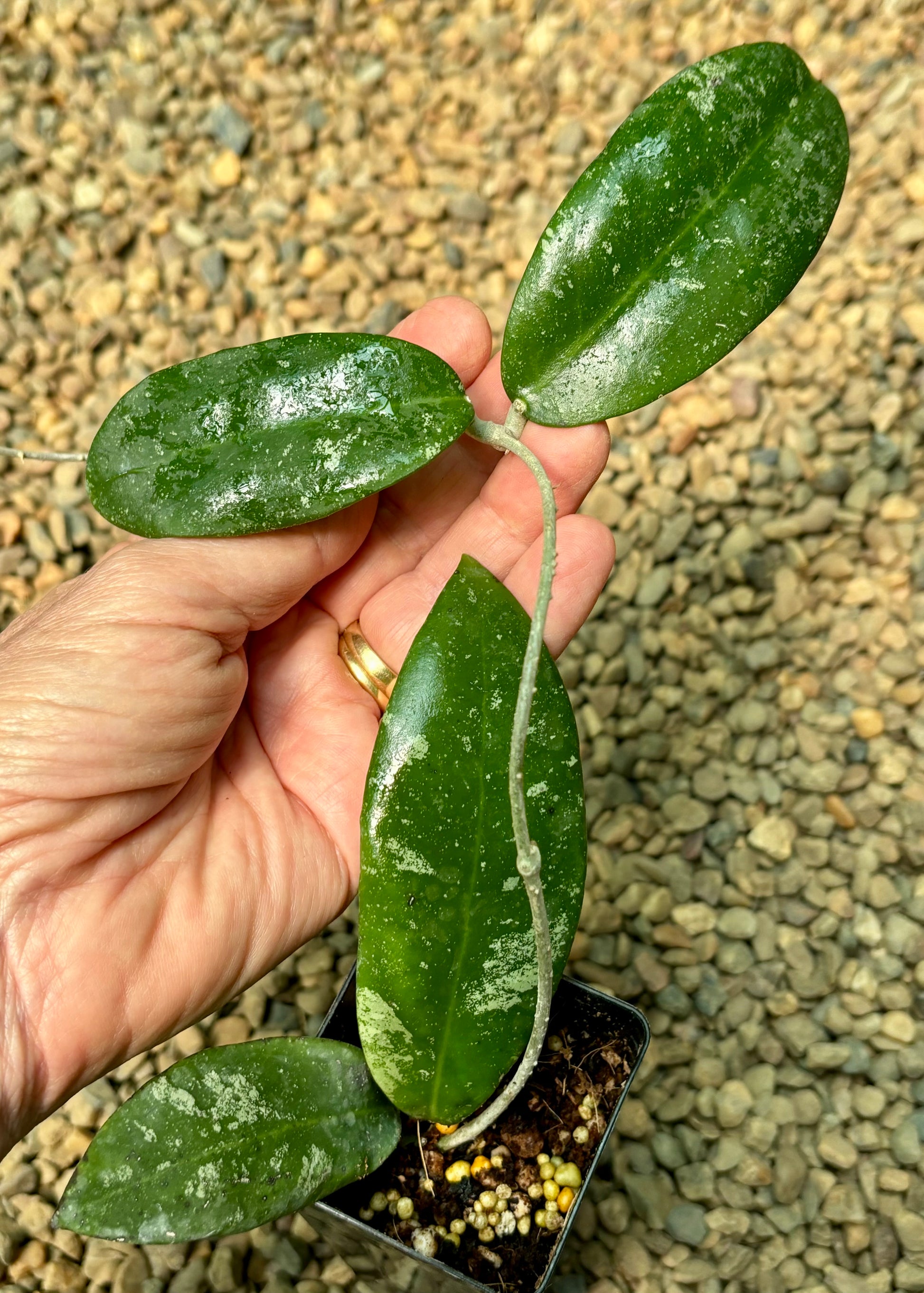 Slender-stemmed climbing hoya with firm, fleshy leaves in pale/mid green colour, measuring up to 10cm x 4cm, with generous splash. Clear sap.
