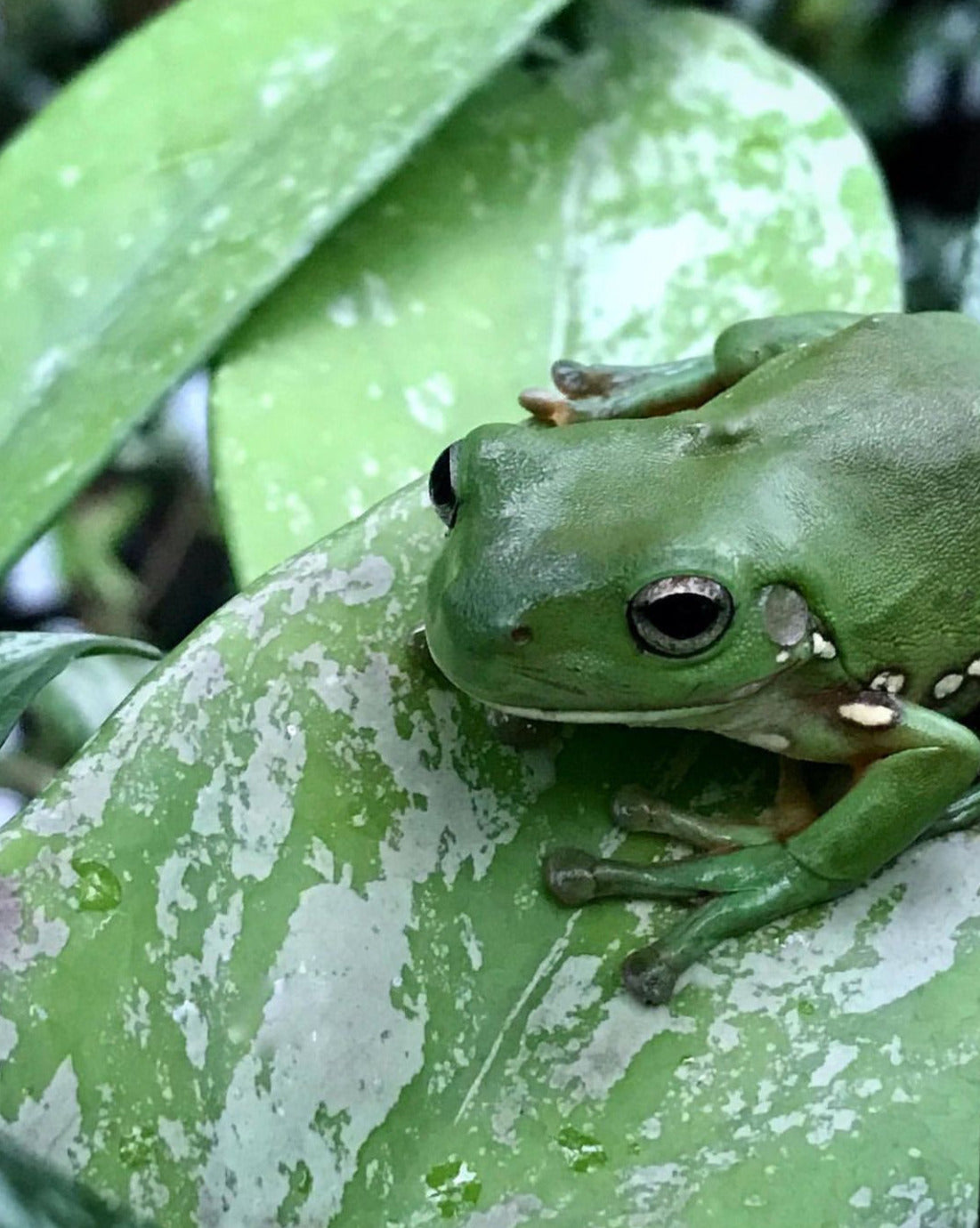Glorious foliage! Pointed narrow leaves, with an abundance of splash, measuring up to 18cm x 6cm. Stems and new growth are often a rich plum-purple colour.